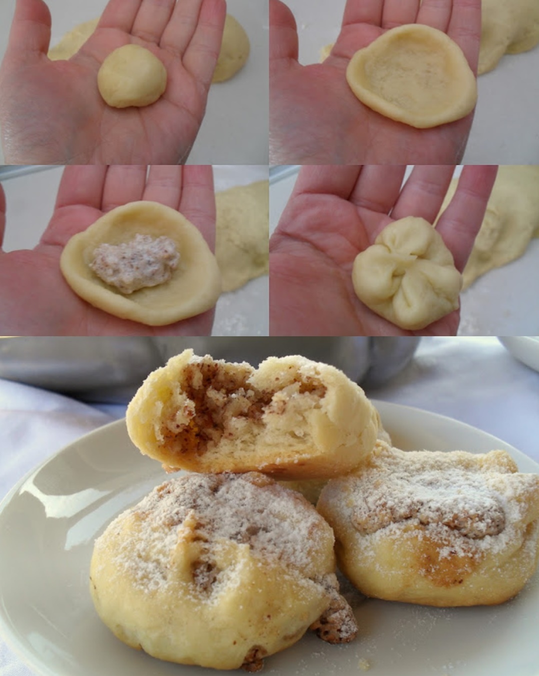 Ovaj put sam kod kuće imao lješnjake jer i mm i ja nismo voljeli čistiti orahe pa sam ih potpuno uništio. Smjesa za nadjev mora biti dosta gusta. Nakon što je tijesto dovoljno naraslo, ponovno ga razvaljajte na lagano pobrašnjenoj površini i premijesite. Od tijesta oblikujte kuglice veličine oraha, svaku odvajajte, au sredinu stavite pola žličice nadjeva.