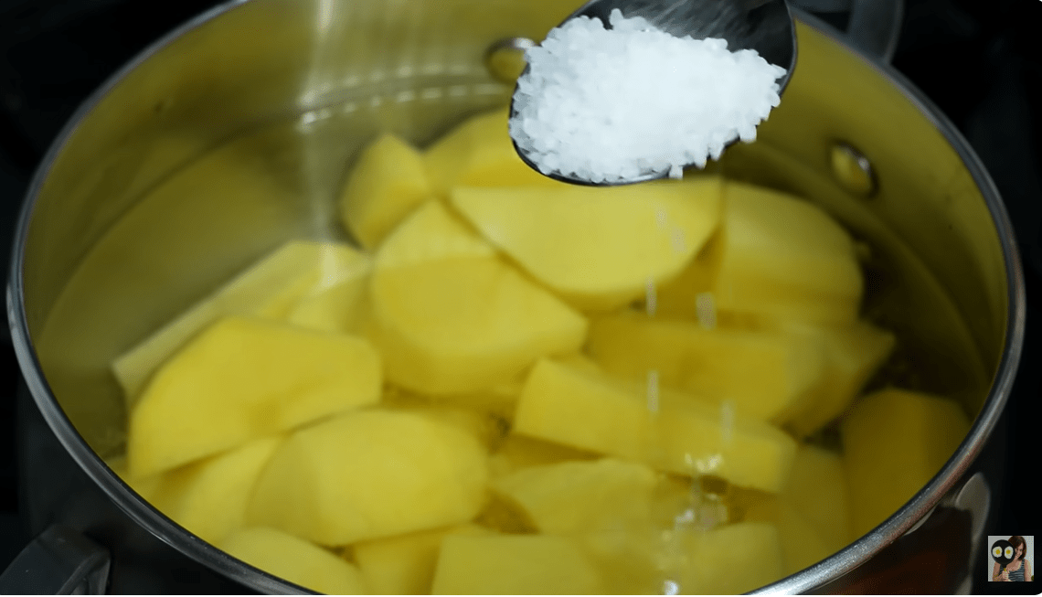 Počnite tako da ogulite krumpir i narežete ga na kockice. Kockice krumpira stavite u lonac napunjen vodom, pa dodajte 1/2 žličice soli. Zakuhajte vodu i kuhajte krumpir dok ne omekša.