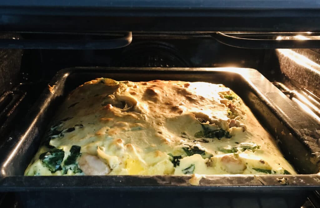Pripremite se za pečenje: Smjesu izlijte u namašćenu posudu za pečenje i ravnomjerno je rasporedite. Na vrh stavite trokutaste ploške sira.