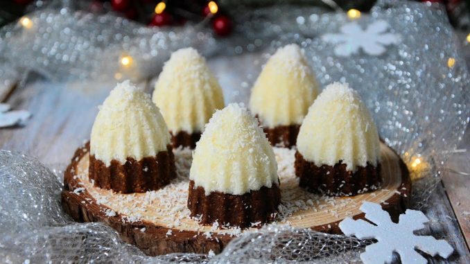 U posudi pomiješajte 150 ml vode sa šećerom i vanilijom, pa smjesu zakuhajte. U zasebnoj posudi izmiksajte 50 ml vode dok ne postane glatka i bez grudica, a zatim je umiješajte u kipuću vodu. Pustite da kuha još 2-3 minute prije dodavanja kokosa. Sve dobro promiješajte i maknite s vatre. U drugoj zdjeli pomiješajte mljeveni keks, šećer u prahu i kakao pa umiješajte otopljeni margarin. Uvjerite se da je sve dobro spojeno. Otvor cjedila za limun prekrijte prozirnom folijom, do pola utisnite bijelu smjesu, a zatim na vrh tamnu. Okrenite cjedilo tako da tamna smjesa bude na dnu, a bijela na vrhu. Po želji po bijeloj smjesi pospite malo kokosa.