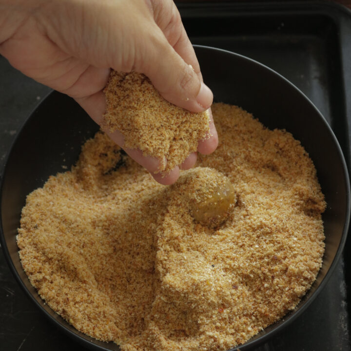Nadjev završite umućenjem slatkog vrhnja i umiješanjem u karamel kremu. Nakon toga u smjesu dodati mljevenu plazmu. Kremom premažite polovice keksa pa na njih stavite druge polovice. Dodatno premažite vanjski rub prije uvaljanja u mljevenu plazmu.