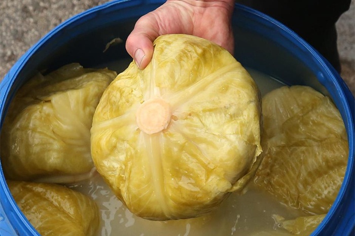 Kako biste rasporedili glavice, na njih stavite plastičnu rešetku ili daske od pene, pritiskajte ih kamenom i ostavite kupus da odstoji preko noći. Ako je sljedećeg dana moguće dodati još jedno grlo, malo povećajte punjenje bačve. Otopite sol u hladnoj vodi dok okus ne postane neugodno slan.