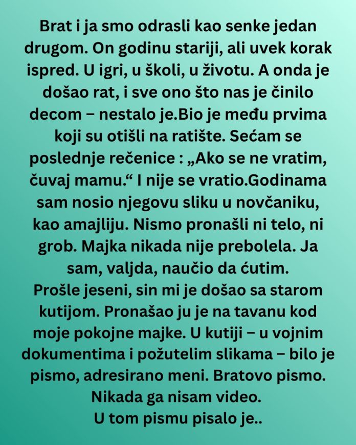 Prošle jeseni došao mi je sin sa starom kutijom. Našao ga je na tavanu moje pokojne majke. U kutiji – među vojnim dokumentima i požutjelim slikama – bilo je pismo naslovljeno na mene. Bratovo pismo.