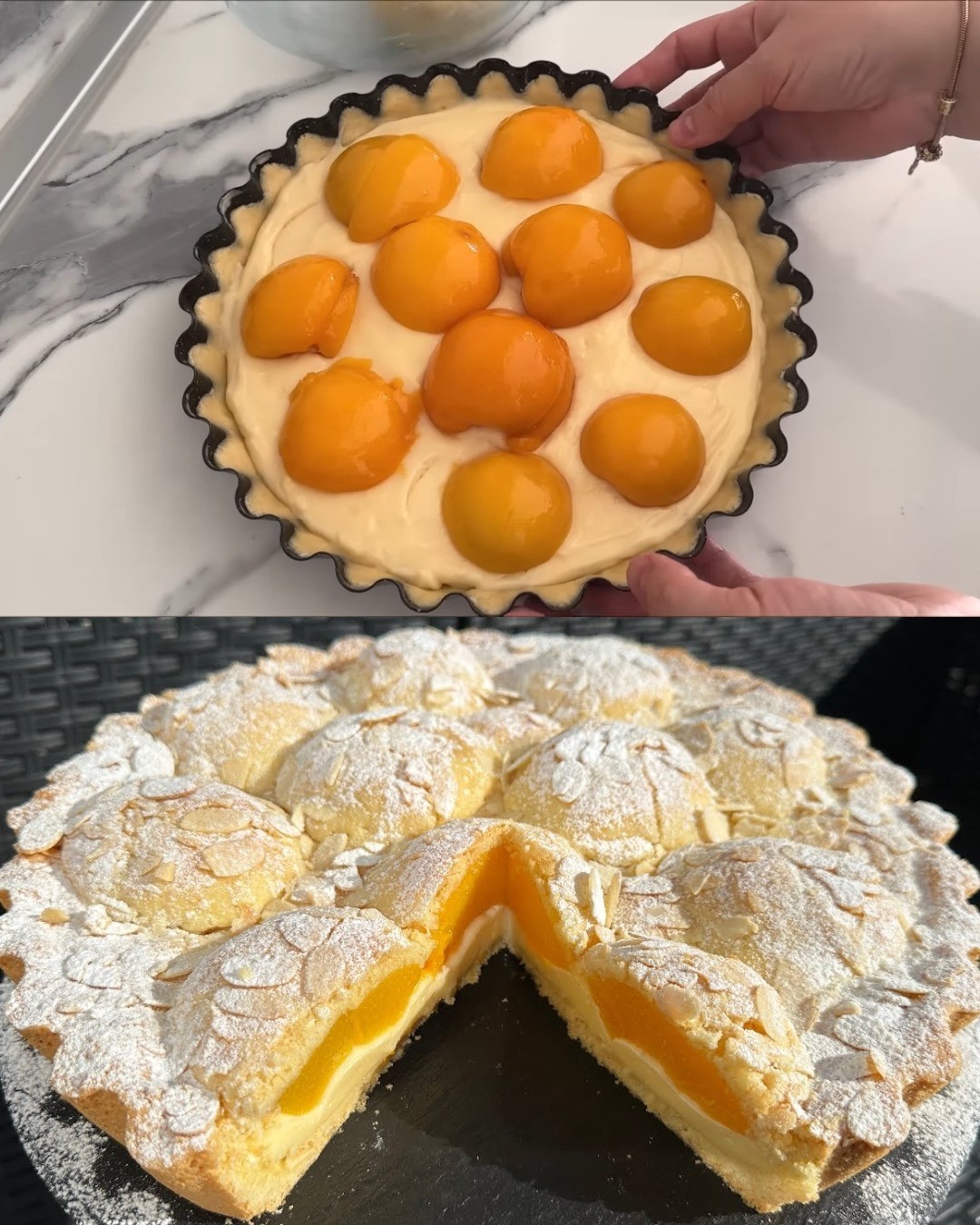 Za izradu kore pokupite sljedeće sastojke: 1 jaje, 100 g šećera, 8 g vanilin šećera, koricu 1 limuna, 140 g omekšalog putera, 300 g brašna 00 i 10 g praška za pecivo. Za nadjev od kreme pomiješajte 400 ml mlijeka, 2 žumanjka, 5 žlica šećera, 8 g vanilin šećera, 3 žlice kukuruznog škroba, 3 žlice kiselog vrhnja ili mascarponea i 30 ml soka od limuna. Na kraju za preljev pripremite 800 g ocijeđenih i narezanih bresaka u soku, zajedno s 1 lagano tučenim bjelanjkom i narezanim bademima. Za dekoraciju pospite šećerom u prahu.