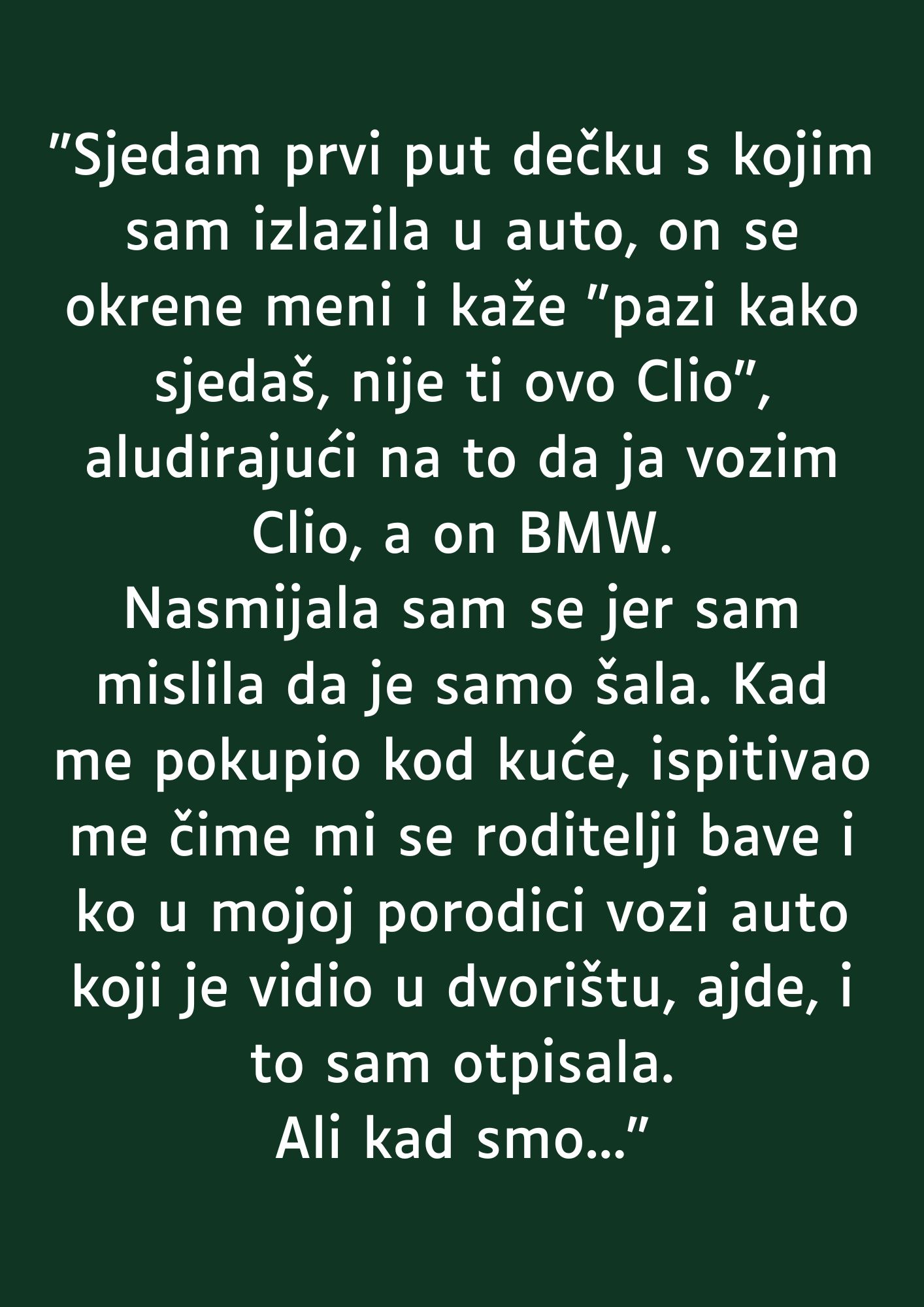 Nakon nekoliko izlazaka s jednim gospodinom, prvi put sam sjela u vozilo, na što mi je on rekao: “Pazi na mjesto, ovo nije tvoj clio”. Ta je izjava implicirala da je mislio da vozim Clio, sugerirajući da ga možda uspoređuje s BMW-om.