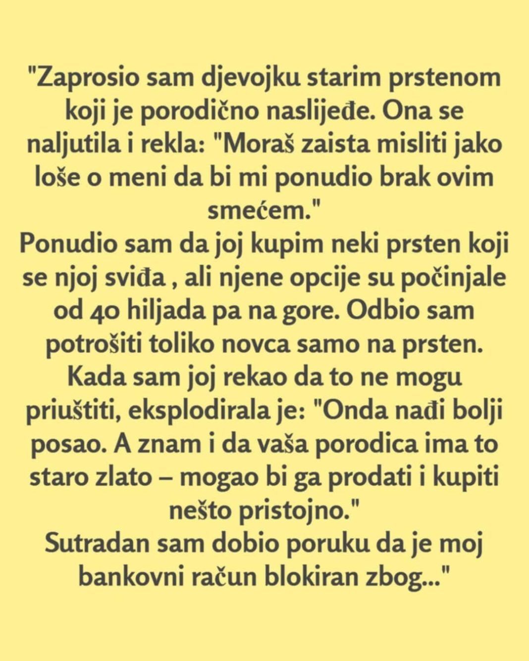 Zaprosio sam mladu ženu koristeći zastarjeli prsten koji je moja obitelj prenijela kao nasljeđe. Kao odgovor, izrazila je svoj bijes i primijetila: “Mora da imaš jako loše mišljenje o meni da me zaprosiš ovim bezvrijednim predmetom.